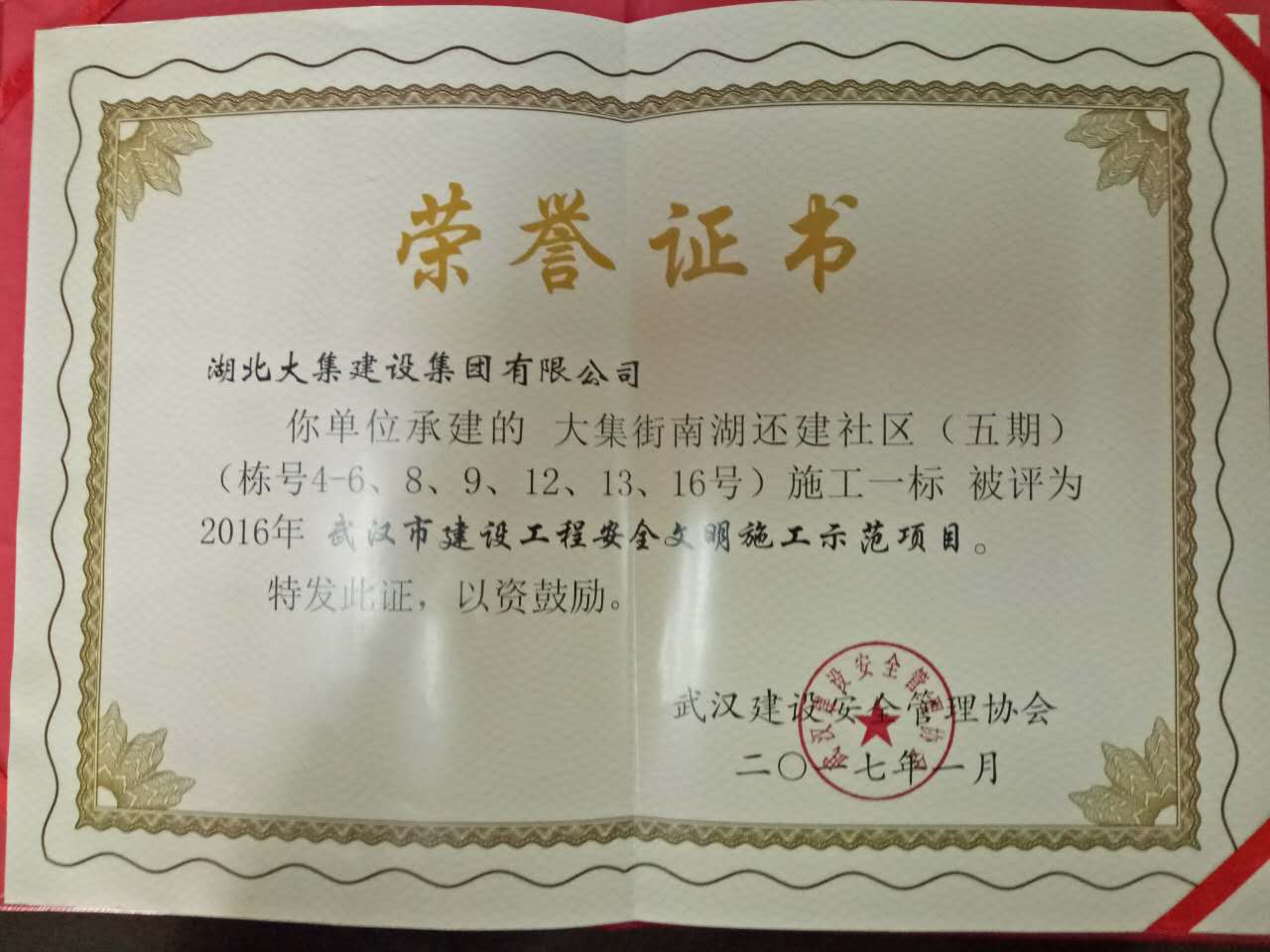南湖五期項(xiàng)目繼4號(hào)樓、5號(hào)樓、6號(hào)樓,8號(hào)樓,9號(hào)樓、13號(hào)樓被上級(jí)監(jiān)管部門評(píng)定為“結(jié)構(gòu)優(yōu)質(zhì)“后,3月份項(xiàng)目部又獲得“湖北省優(yōu)秀建筑工地農(nóng)民工業(yè)余學(xué)校”榮譽(yù)稱號(hào),4月12日,南湖五期4號(hào)樓、5號(hào)樓、8號(hào)樓、9號(hào)樓、12號(hào)樓、13號(hào)樓、16號(hào)樓再次被武漢建設(shè)安全管理協(xié)會(huì)評(píng)為"武漢市建筑工程安全文明施工示范項(xiàng)目",為湖北大集建設(shè)集團(tuán)再贏回一座黃鶴杯!