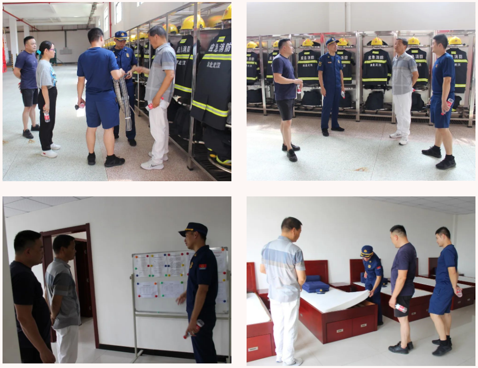 大集消防救援站教導員盧志帶著大家參觀了消防裝備庫及消防官兵備勤室,參觀中,集團公司副總經(jīng)理徐家富與盧教導員進行了深入交流,詢問官兵們的日常生活及工作情況,并向高溫下堅持訓練、持續(xù)工作的他們表示敬意。